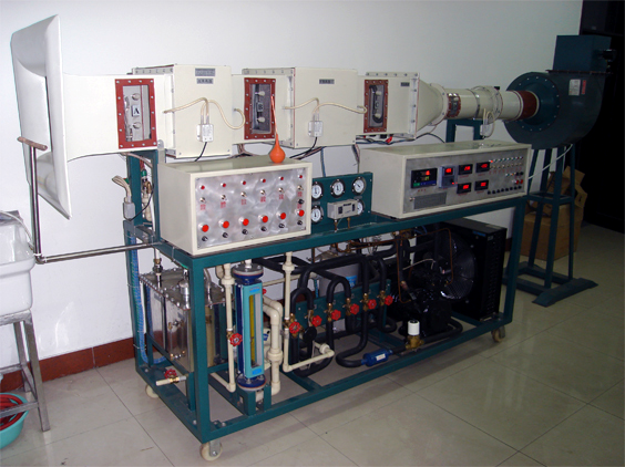 主要配置:可視測(cè)試風(fēng)洞,引風(fēng)機(jī),自動(dòng)調(diào)節(jié)風(fēng)門,制冷壓縮機(jī),風(fēng)冷冷凝器,鈦包蒸發(fā)器,儲(chǔ)液罐,水冷冷凝器,冷凝—蒸發(fā)可互換表冷器,熱水加熱及冷水表冷器,不銹鋼蒸汽加濕鍋爐,可改變制冷、制熱的電磁閥組,溫濕度測(cè)試及水流量、風(fēng)流量測(cè)試用16路萬能信號(hào)輸入液晶漢化顯示巡檢儀顯示,溫濕度由A級(jí)Pt100(0.1℃)鉑薄膜熱電阻測(cè)量,水流量及風(fēng)流量測(cè)試用差壓傳感器測(cè)量,II型增加帶標(biāo)準(zhǔn)信號(hào)的多路萬能信號(hào)輸入巡檢儀,增加帶標(biāo)準(zhǔn)信號(hào)的數(shù)顯電流表電壓表,增加文丘里流量計(jì)配差壓傳感器測(cè)流量,增加調(diào)頻裝置調(diào)節(jié)壓縮機(jī)功率,軟件等。