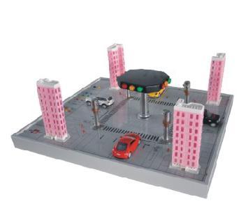 本企業(yè)設計開發(fā)的模型為實際十字路口現(xiàn)況按比例微縮而成,主要由仿真實物建筑模型、車輛實物模型、道路模型及交通指揮燈等部件組成。有電源指示和控制、啟/停按鈕、手/自動按鈕、行人呼叫按鈕、四方向紅/黃/綠燈點陣指示模塊(具有東西南北十二方向顯示)、四方向數(shù)碼倒計時顯示模塊,車輛行進聲光指示(不同方向的車行進時可用不同的聲音及指示燈進行指示)等??刂破鞑捎茫蝗庵鳈C為FX1N-24MR 內置開關量I/O(14路開關量輸入/10路數(shù)字量輸出)+FX2N-8EYR(8路數(shù)字量輸出)。選用的主機功能齊全,性能優(yōu)越。實訓操作靈活方便,能滿足大中專院校、職業(yè)技術學校、職教中心可編程控制器技術的教學、課程設計和畢業(yè)設計。