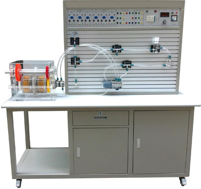1、濕式離合器變速箱結構與PLC控制實訓裝置主要由實訓桌、實訓臺、濕式離合器變速箱、液壓元件和電器控制器件、可編程控制器(PLC)等器件組成。